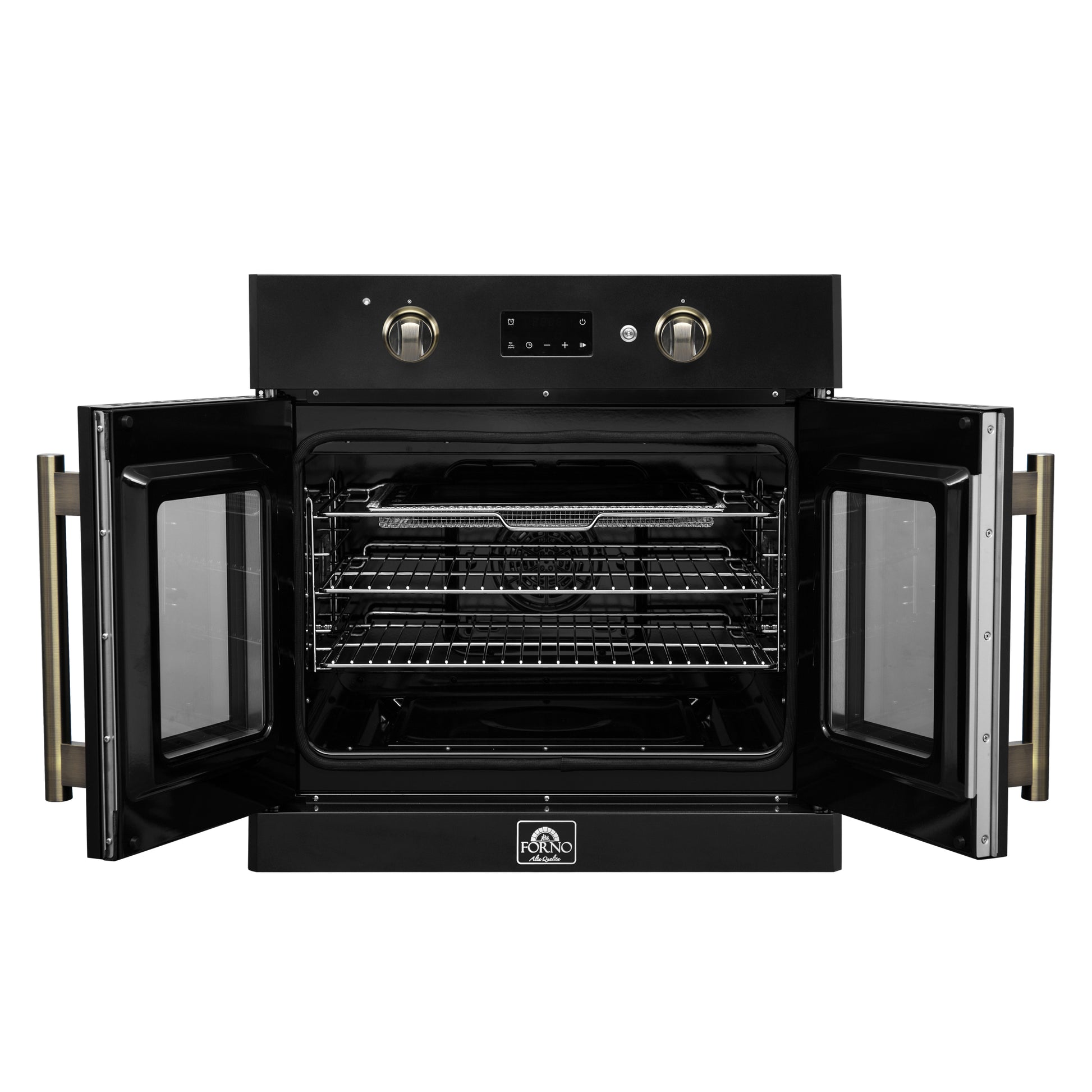 Horno eléctrico de pared Forno Asti de 30 pulgadas con puerta francesa en negro y latón antiguo, 3,68 pies cúbicos, convección real, 3600 W, freidora de aire, sous vide, autolimpieza
