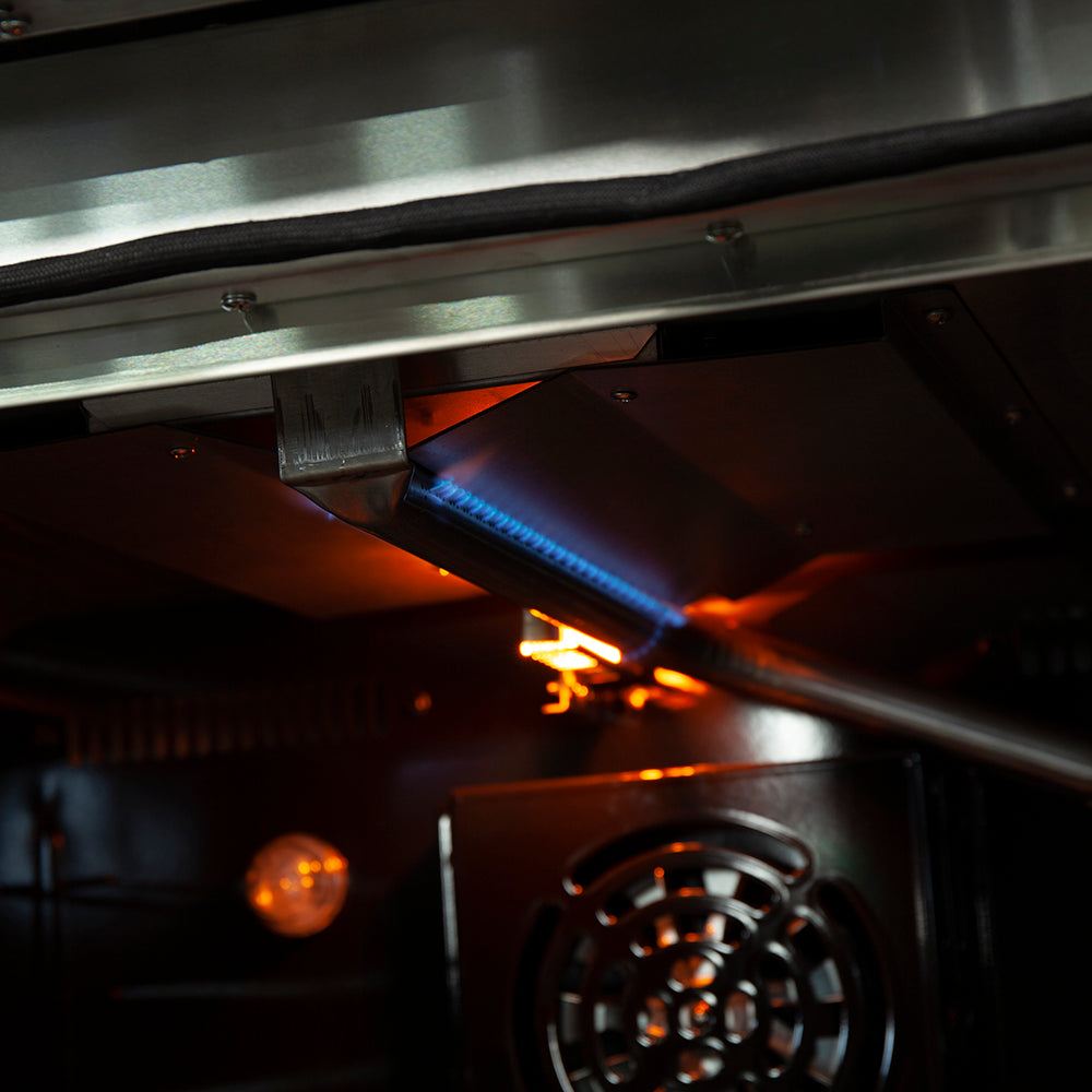 * Un quemador de doble anillo de 20,000 BTU ofrece calor potente para sellar y 1,000 BTU suaves para cocinar a fuego lento.