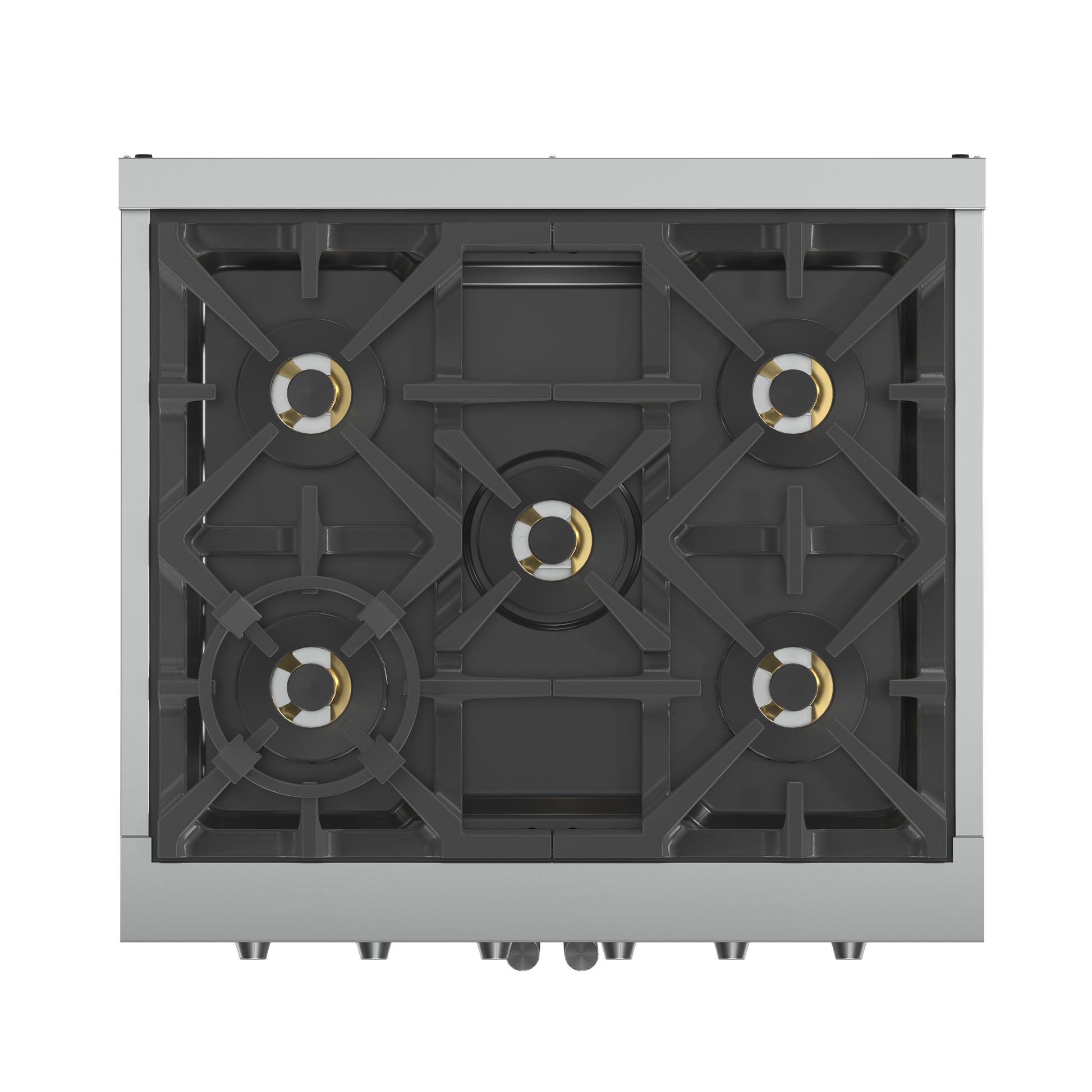 * 5 quemadores de latón de doble anillo sellados combinan una estufa total de 100.000 BTU.
