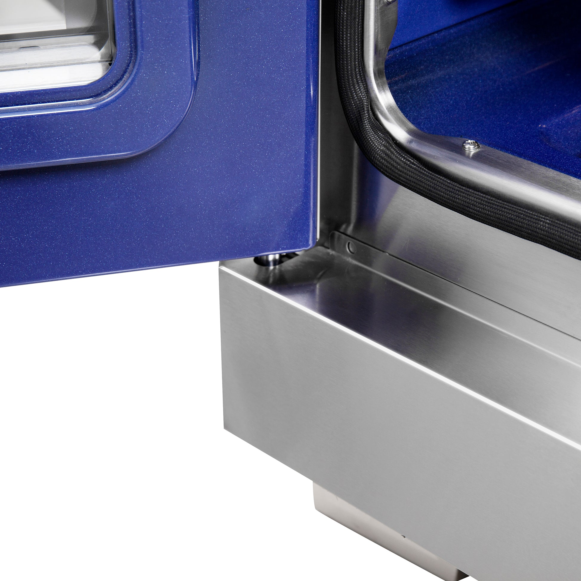 * El horno de esmalte azul moteado, de 5,36 pies cúbicos, cuenta con un ventilador de convección activado por interruptor con una salida total de 30.000 BTU.