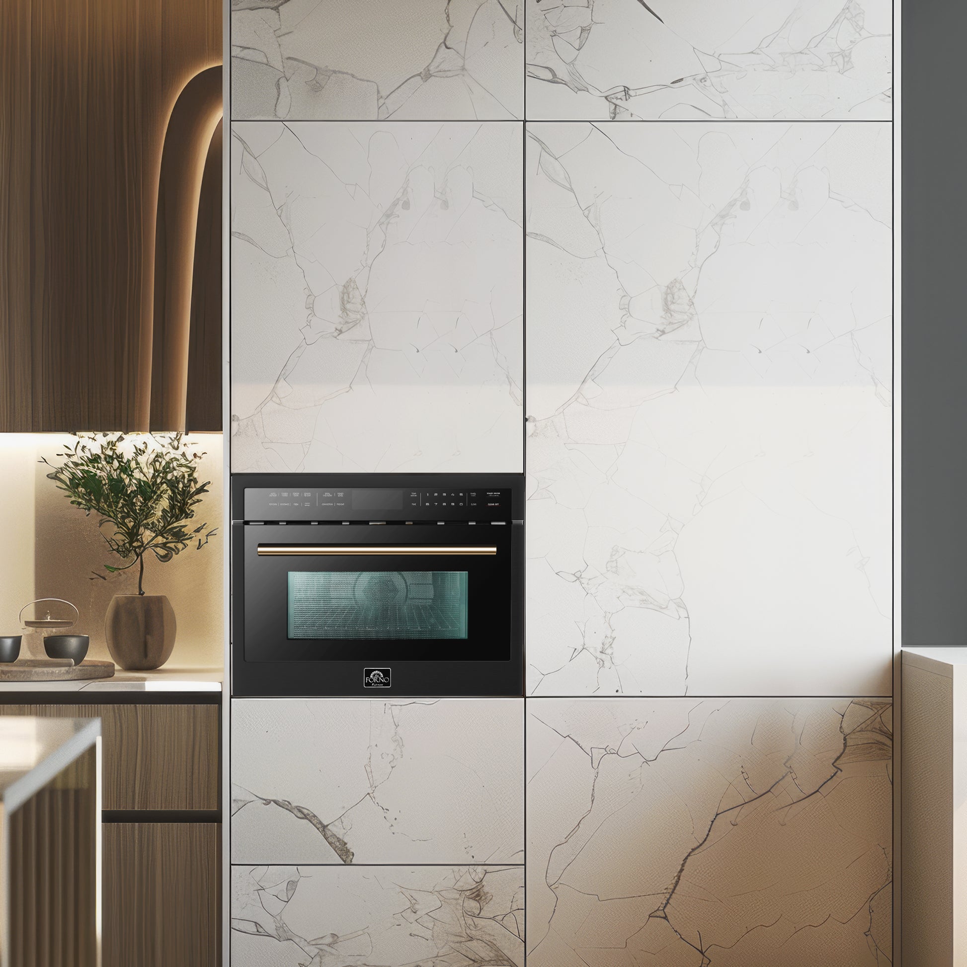 Horno de microondas y convección integrado Forno Oliena Espresso Black de 24 pulgadas, 1.6 pies cúbicos, 1750 W de convección, 1000 W de microondas, interior de acero inoxidable, controles táctiles de vidrio, cocción por sensor.