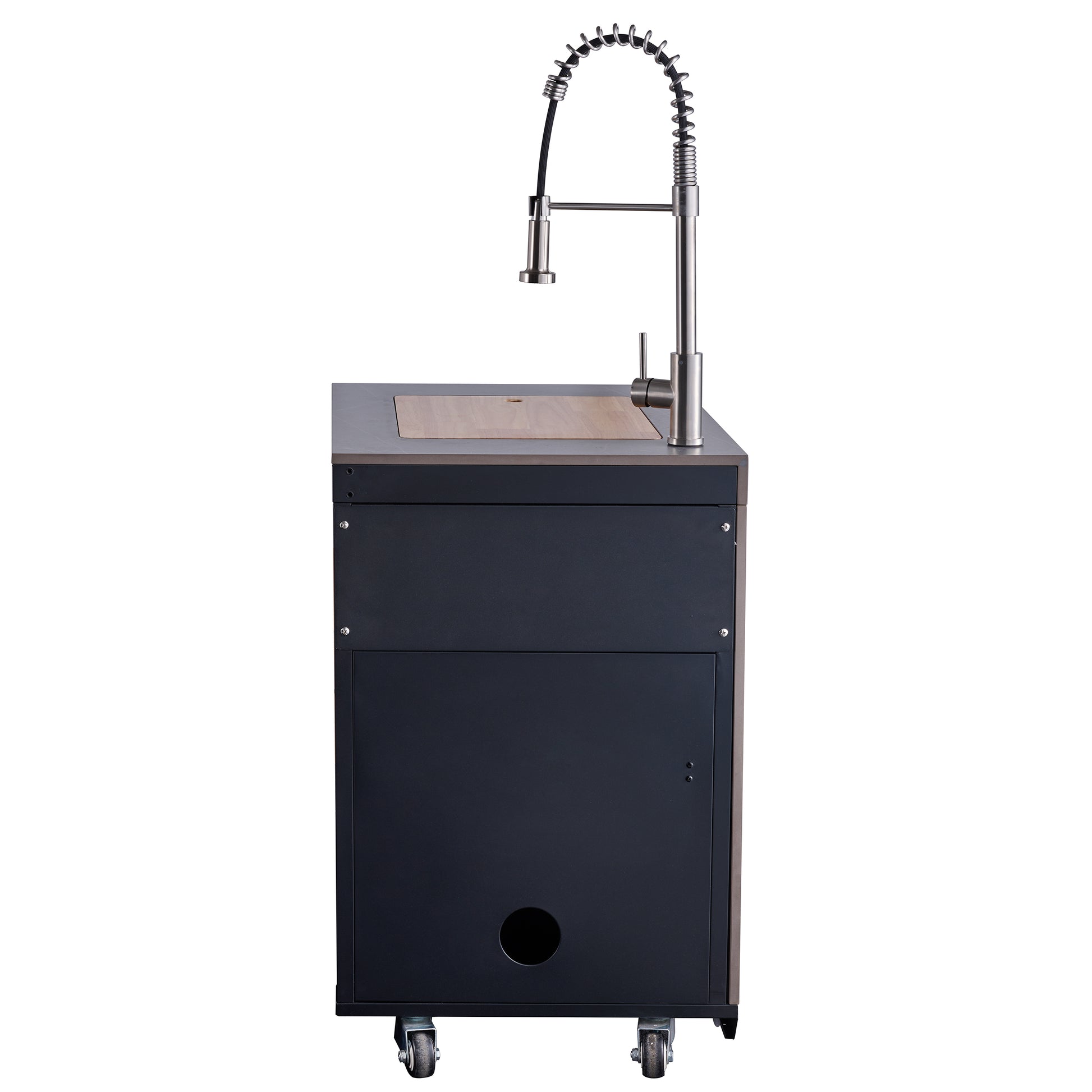 Cocina para exteriores Forno Rimini, barbacoa de 76 cm, 62 600 BTU, 3 quemadores con sellador y asador, centro de bebidas de 0,78 m³, fregadero de acero inoxidable, gabinetes negros y encimera de piedra sinterizada gris.