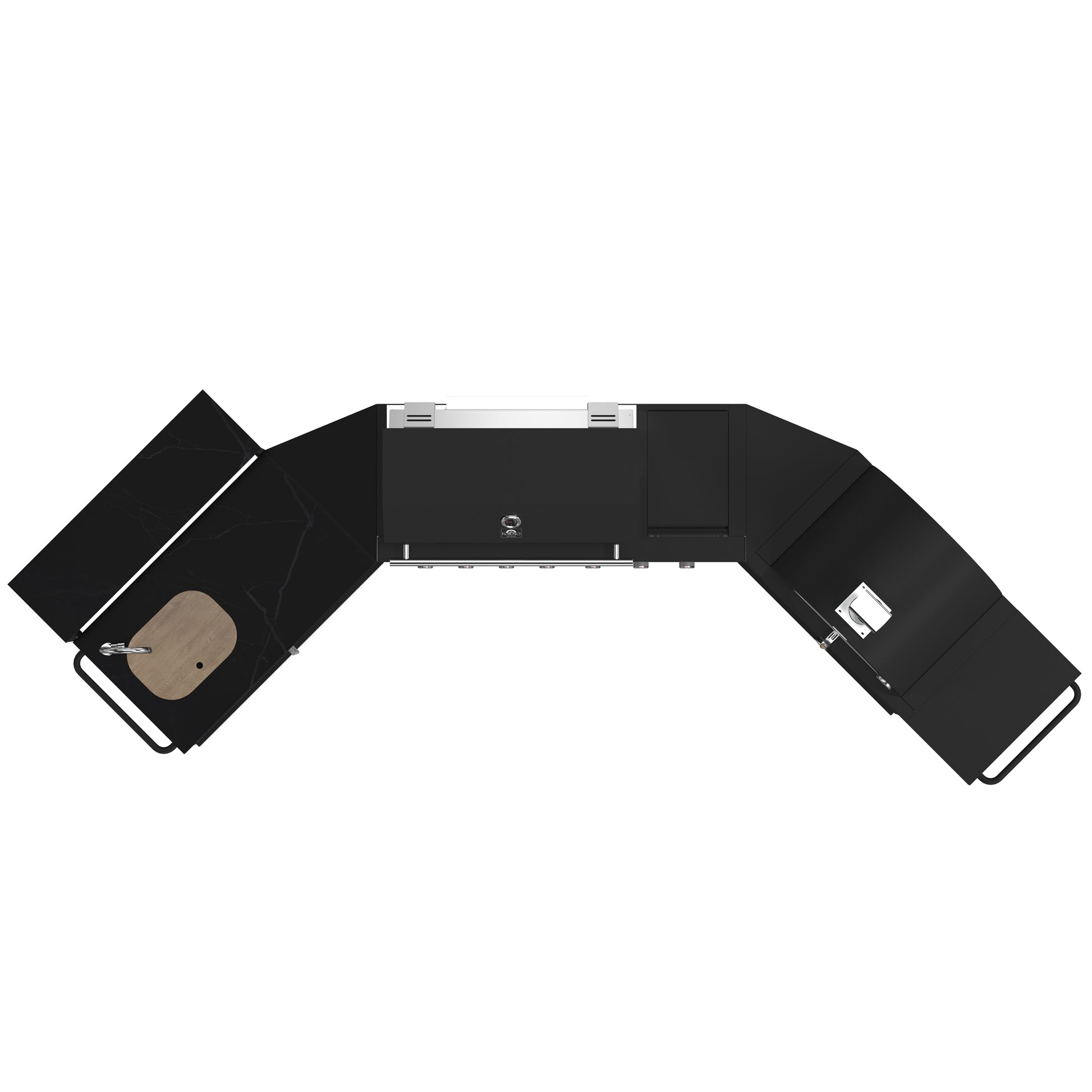 Cocina exterior Forno All'Aperto de 87,600 BTU con 4 quemadores, quemadores infrarrojos, quemador lateral, encimeras de piedra sinterizada negra, horno de pizza a gas, módulo de fregadero, barra y centro de bebidas.