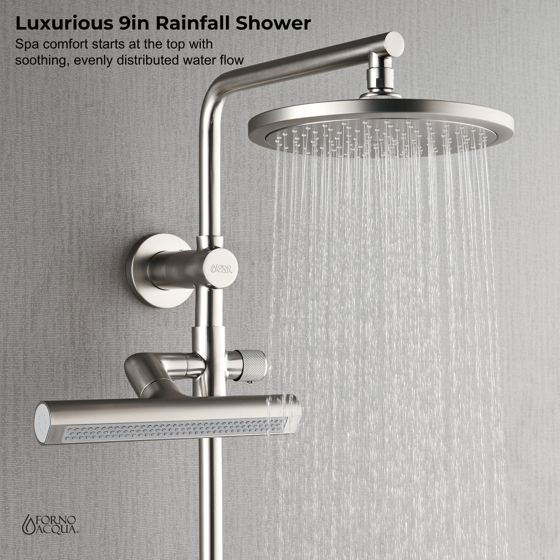 Forno Acqua AcquaFALL Shower, Brushed Nickel Finish, Overhead Rainfall Shower, Handheld Shower Head, Body Jets, 2.5 GPM Flow Rate