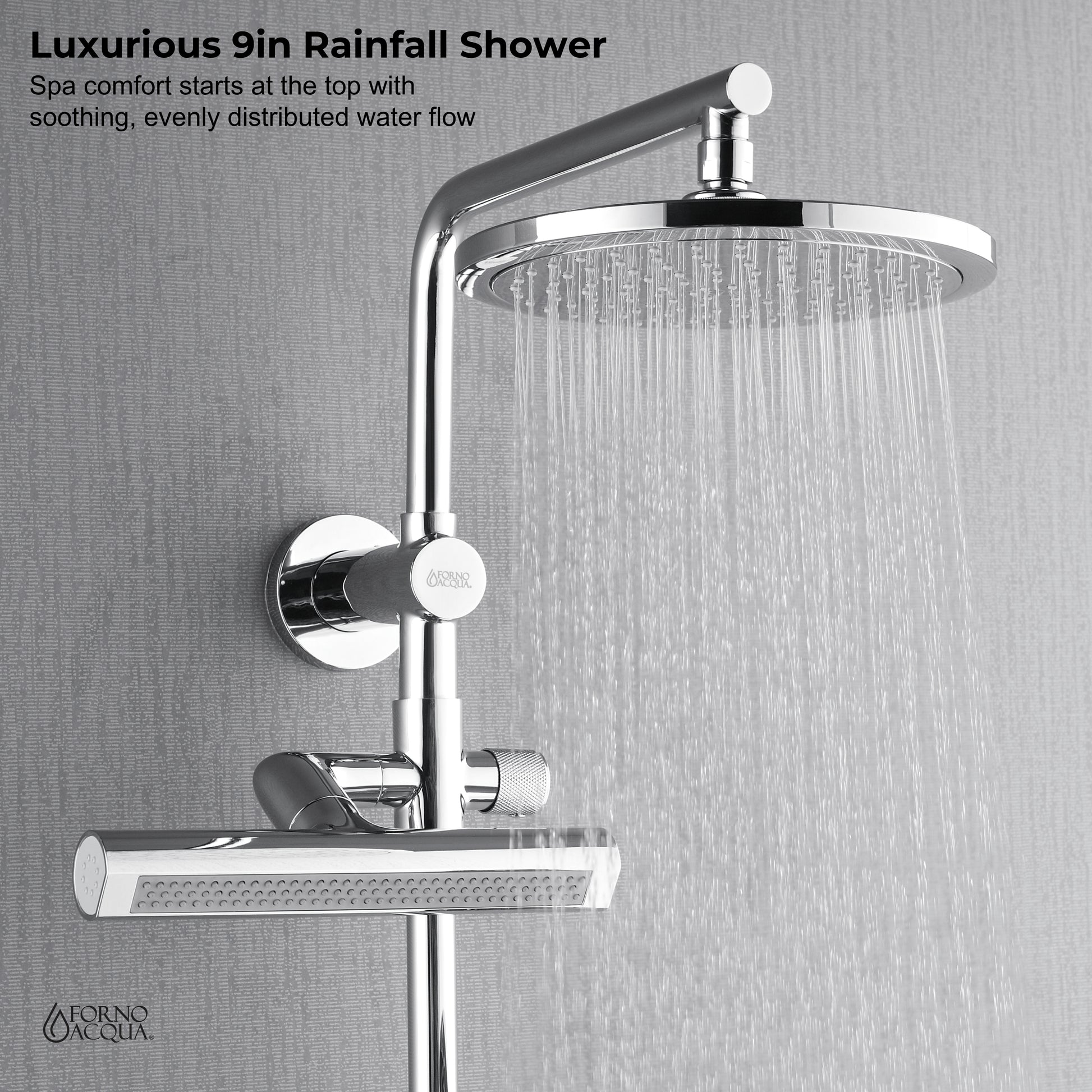 Forno Acqua AcquaFALL Shower, Polished Stainless Steel Finish, Overhead Rainfall Shower, Handheld Shower Head, Body Jets, 1.8 GPM Flow Rate