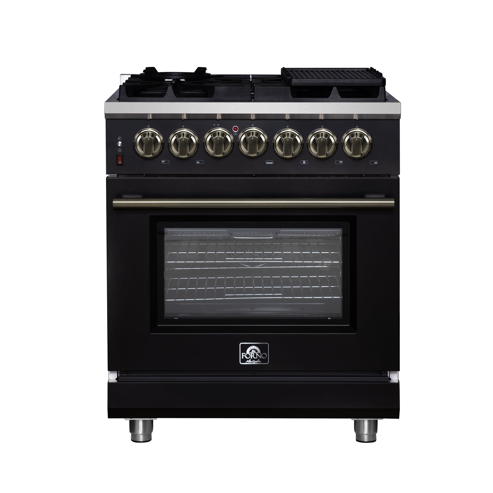Cocina independiente Forno Massimo de 30 pulgadas con doble combustible, color negro y accesorios de latón antiguo, 4 quemadores y horno de convección de 4.32 pies cúbicos.