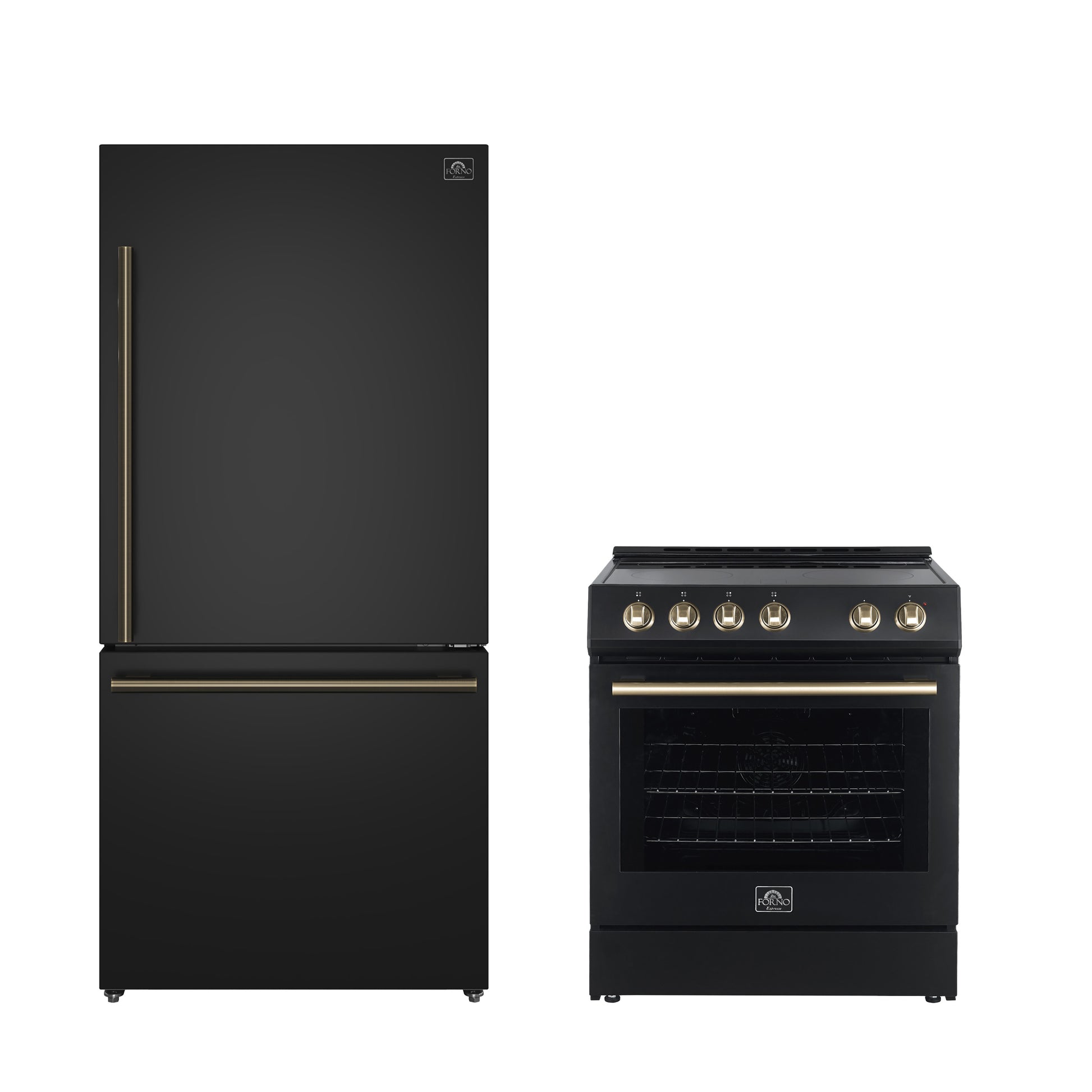 FORNO Premium 2-Piece Kitchen Bundle - Leonardo Espresso 30" Black Range, 31" Black Bottom Freezer Refrigerator - FBDL-003-02CA