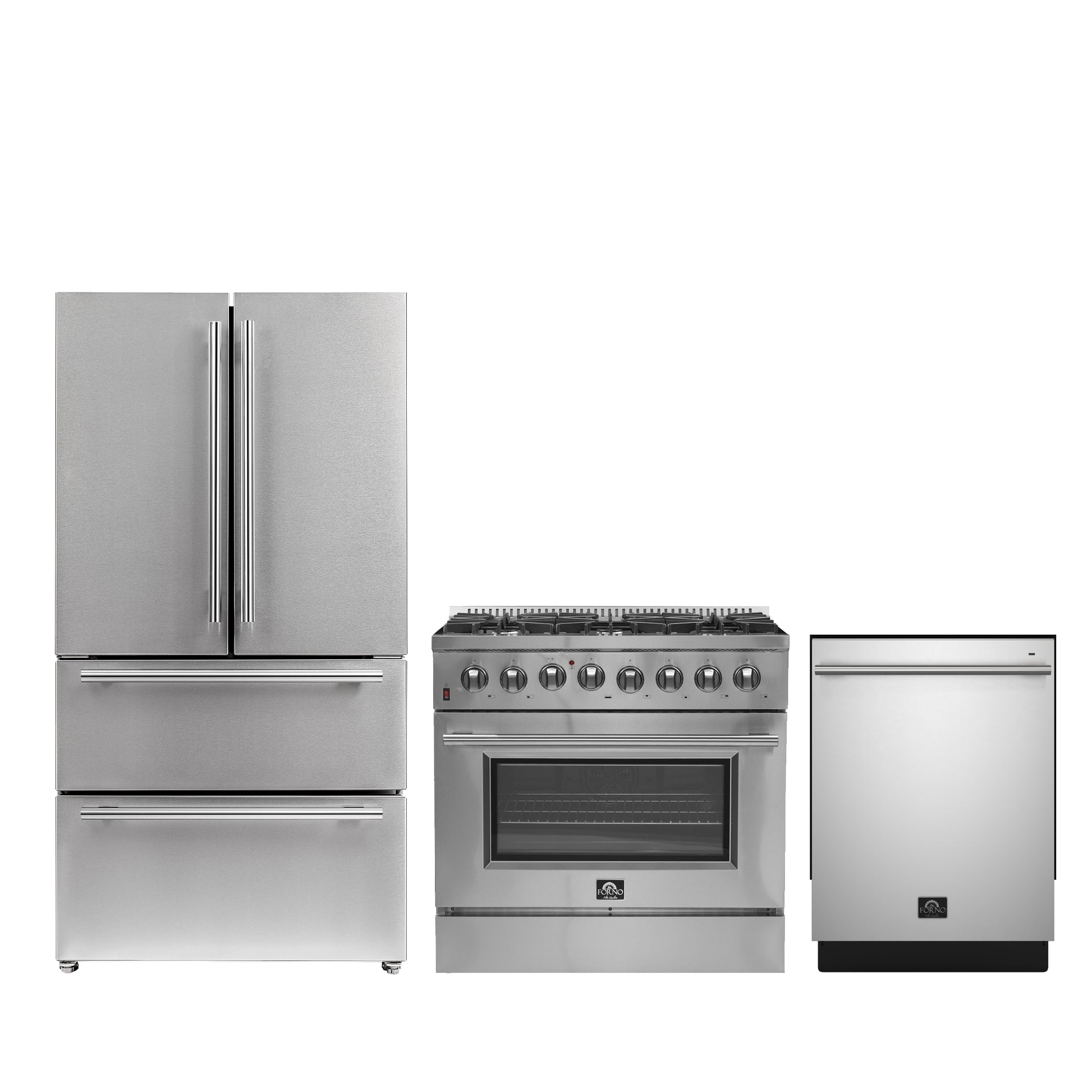 FORNO Premium 3-Piece Kitchen Bundle - 36" Gas Range, 36" French Door Refrigerator, 24" Built-In Dishwasher, Stainless Steel - FBDL-009-02CAUS