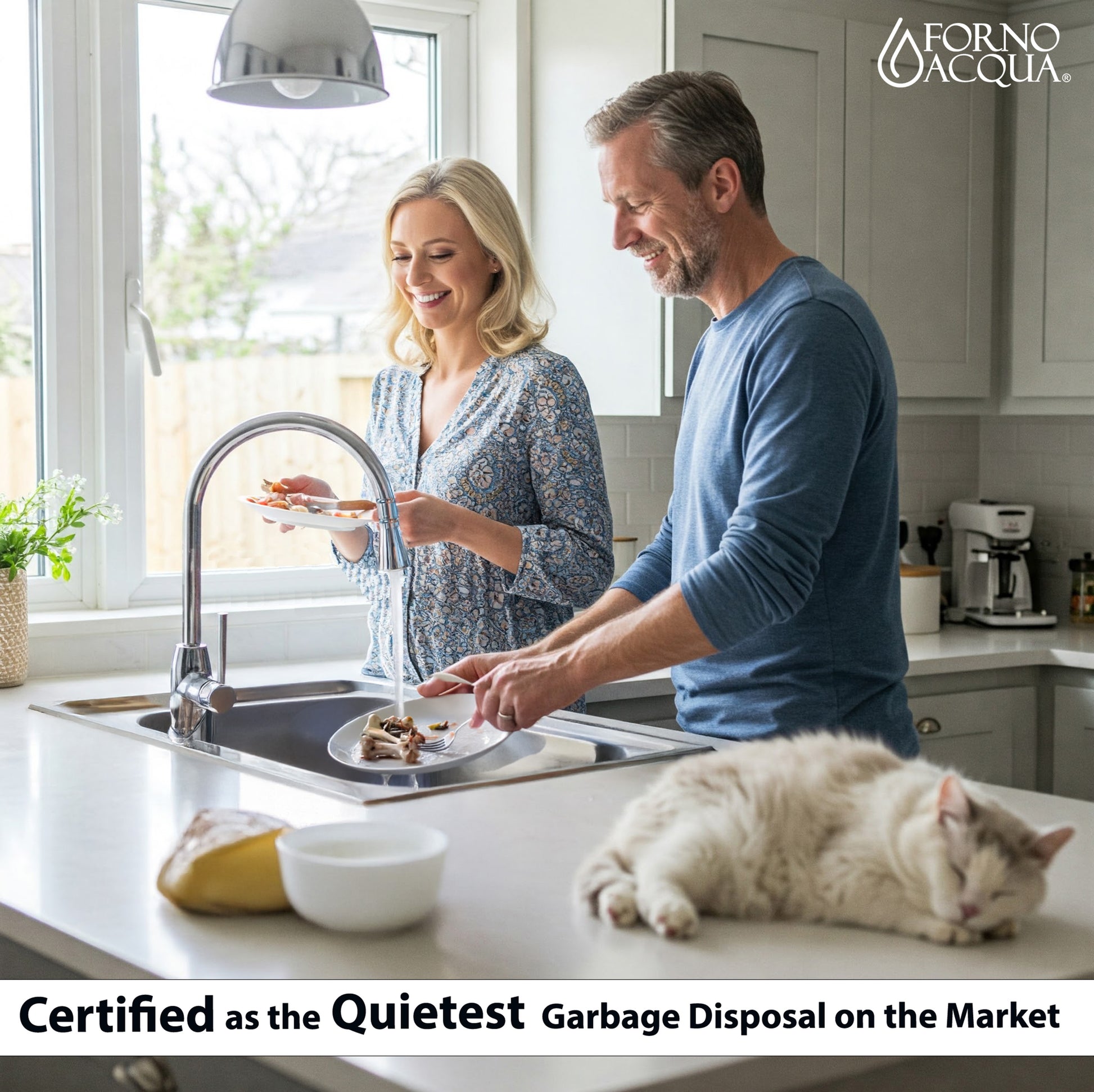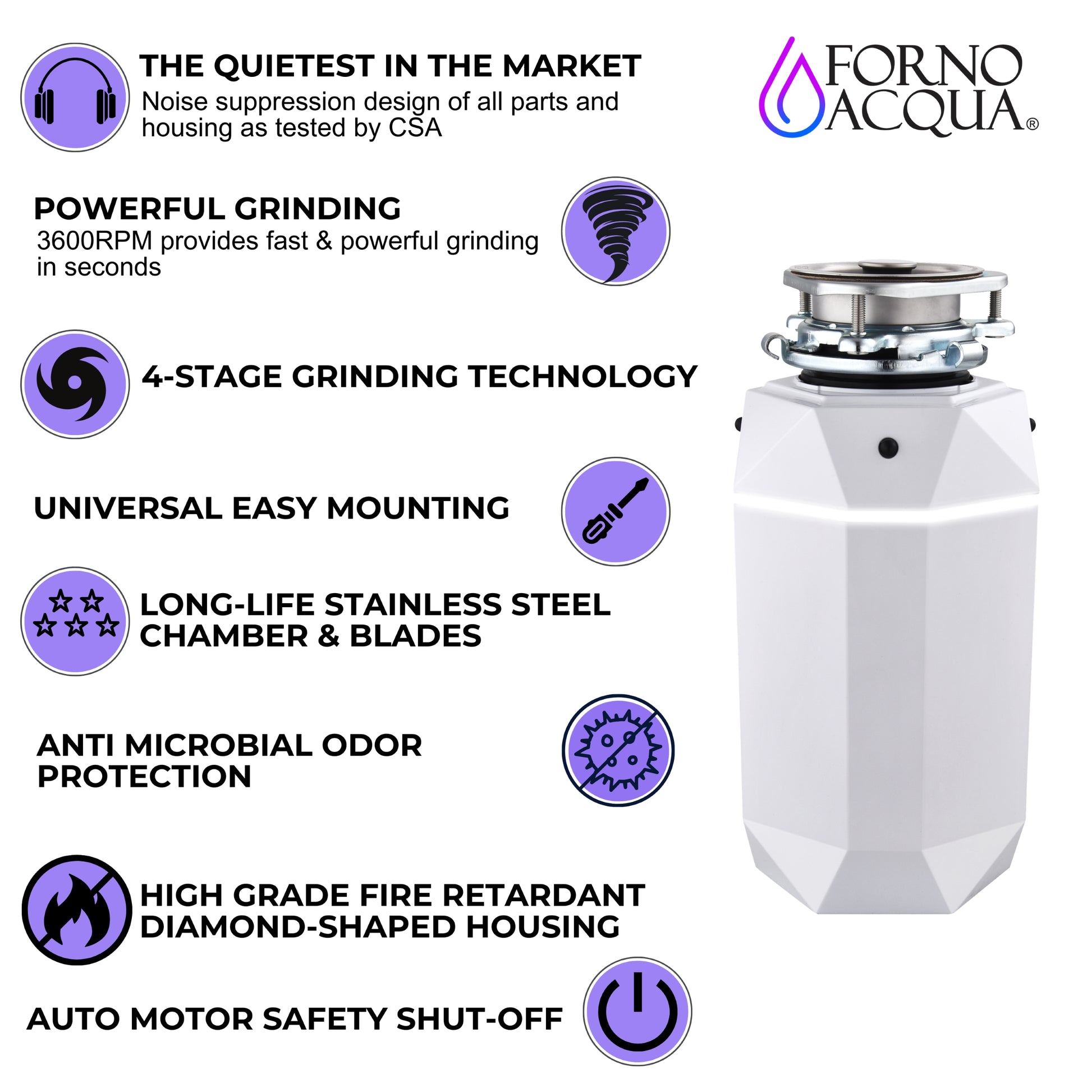 Triturador de basura ultra silencioso FORNO ACQUA BrightDIAMOND Moonstone de 3/4 HP con cable, sensor de movimiento, luz de gabinete e interruptor de aire precableado