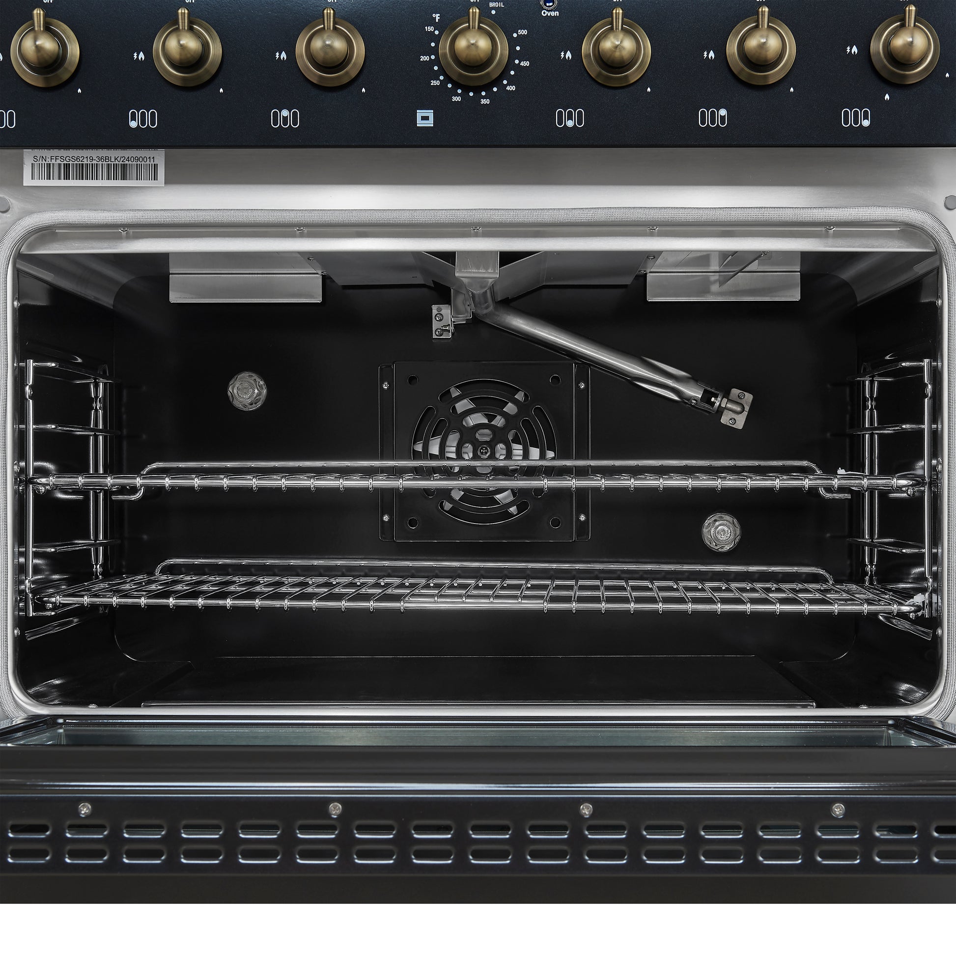 Cuisinière à gaz autonome Forno Antico de 36 pouces, noire, design en laiton antique, 6 brûleurs, four à convection, écoénergétique