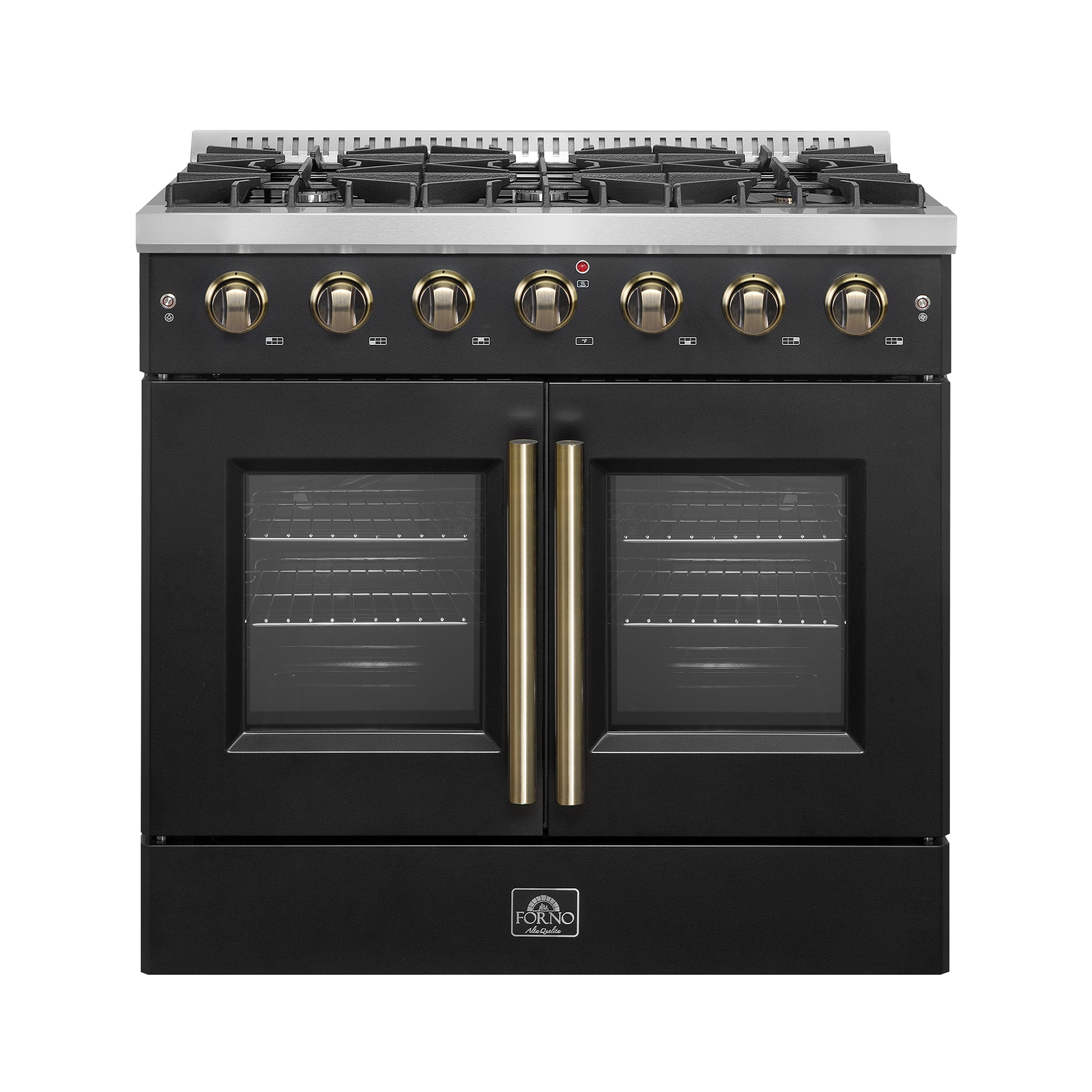 Cuisinière à gaz à portes françaises Forno Galiano de 36 pouces, design noir et laiton antique, 6 brûleurs scellés, 83 000 BTU, four à convection de 5,36 pi³