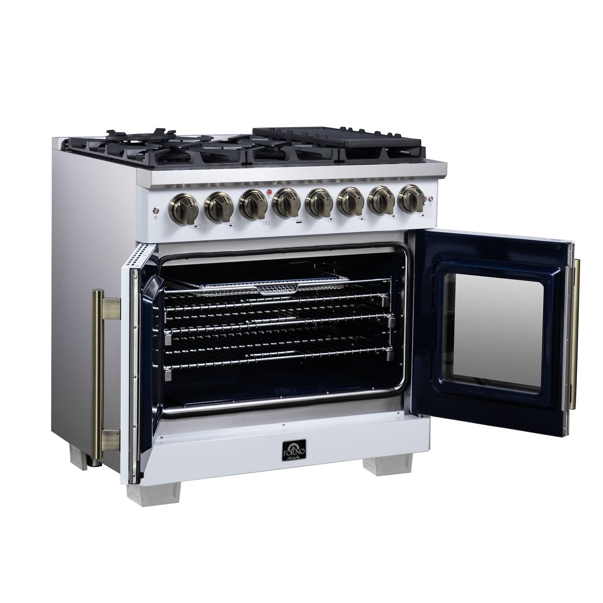 Forno Capriasca 36 Inch Freestanding French Door Dual Fuel Range in White with Antique Brass Accessories, 6 Burners, True Convection Oven