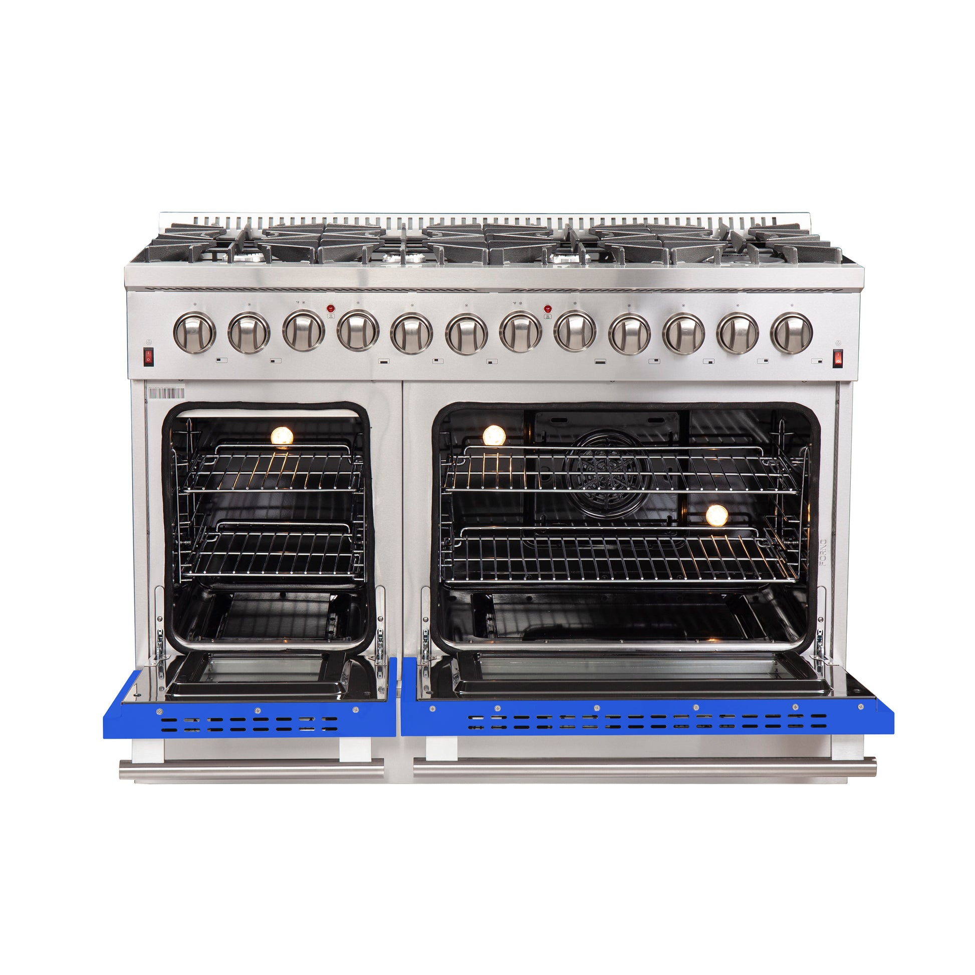 Forno Galiano 48-Inch Freestanding Dual Fuel Range, 8 Burners, Double Convection Ovens, Blue Doors