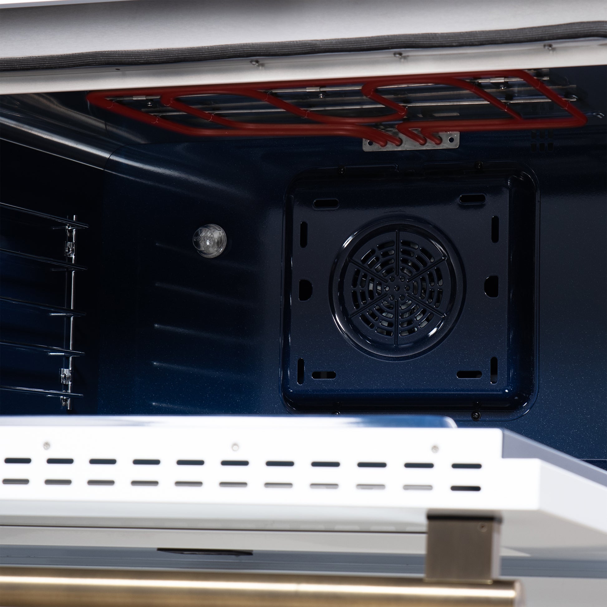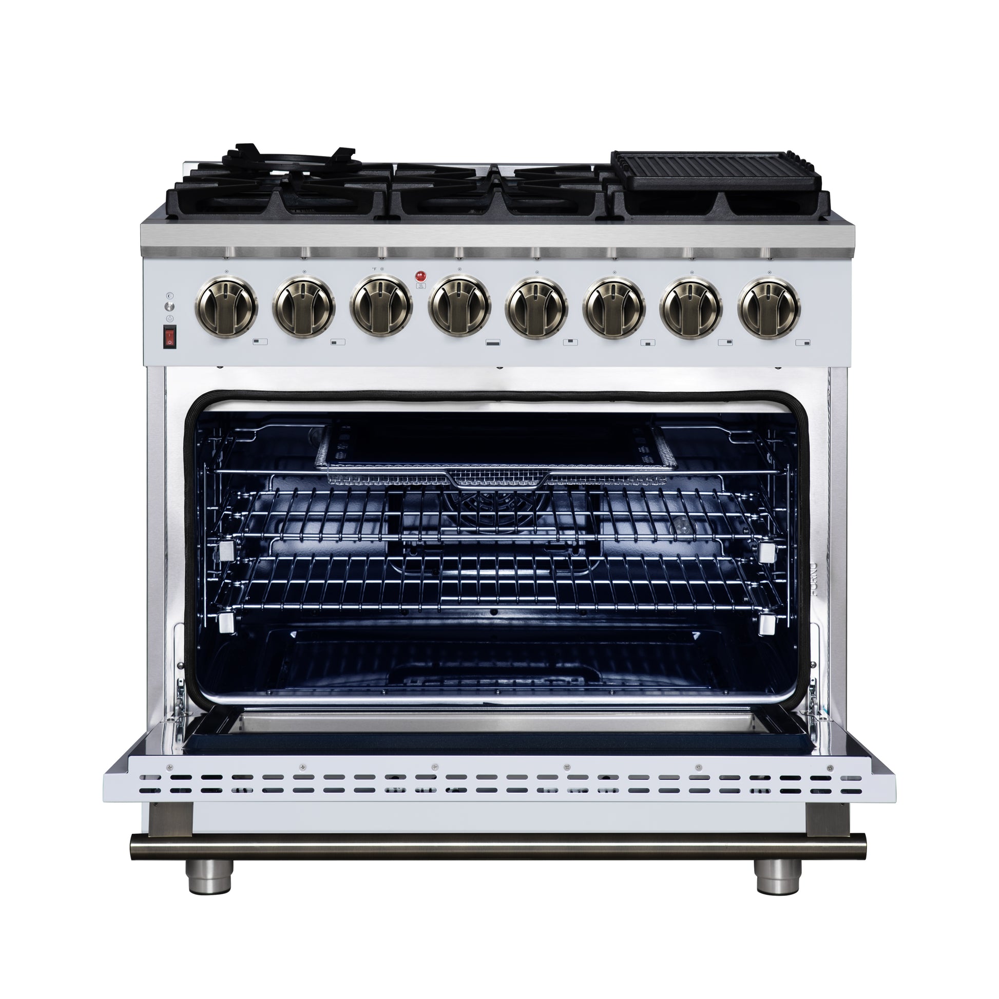 Cuisinière bi-énergie autonome Forno Massimo de 36 pouces, blanche, avec accessoires en laiton antique, 6 brûleurs et four à convection de 5,36 pi³.