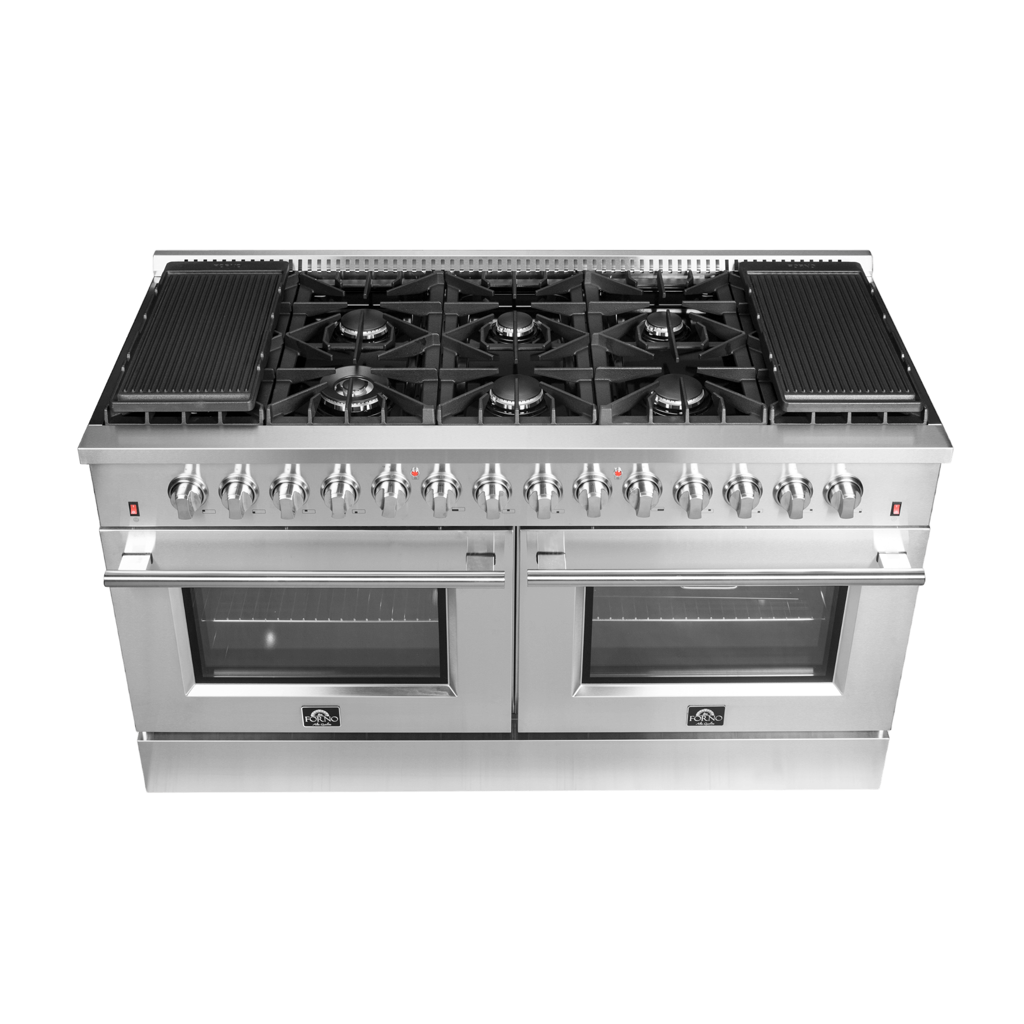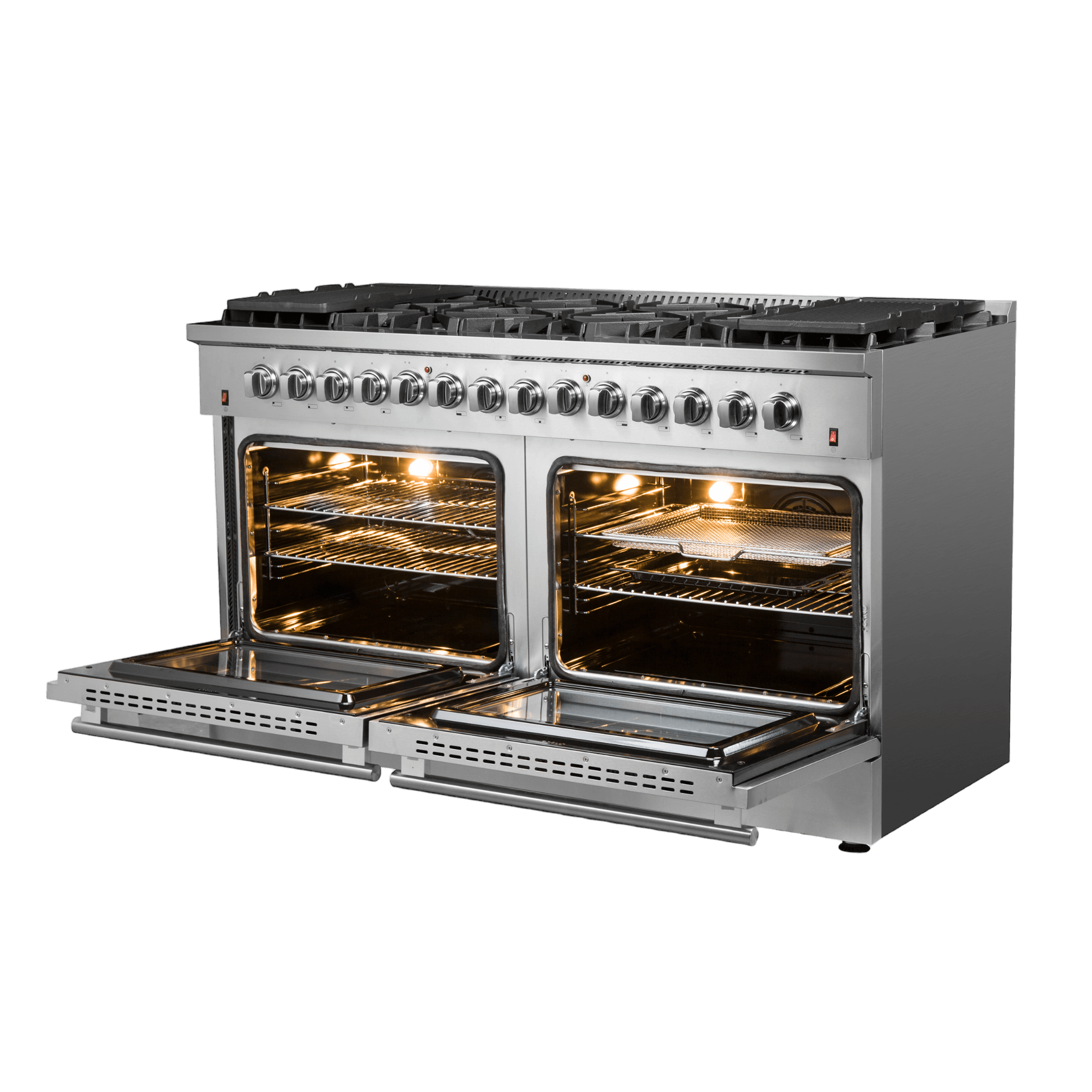 The Forno Galiano 60-Inch dual fuel range, combining professional styling and performance with its durable stainless-steel design. The cooking surface features 10 sealed burners with a total output of 142,000 BTU, including 2 powerful 20K dual-ring burners for boiling, searing, and simmering tasks like melting chocolate or sauces. The continuous cast iron grates ensure maximum stability for cookware and easy sliding of pans off hot burners. With two ovens boasting a combined 8.64 cu.ft. capacity and a total output of 12,600 Watts, this range offers ample power for baking, roasting, and broiling. Both ovens are encased in a black enamel interior and equipped with a true convection fan element of 1500 Watts for fast, precise, and consistent cooking. The 3-layer glass oven door window allows for easy viewing. Included with the range are 4 easy-access oven racks, 2 reversible griddles, an air fryer basket with a drip pan, a wok support, an LP conversion kit, and a NEMA 14-50P power cord for easy installation. Additionally, the zinc-coated metal knobs with bezel rings are designed to maintain their beauty for years to come, adding a touch of sophistication to your kitchen space.