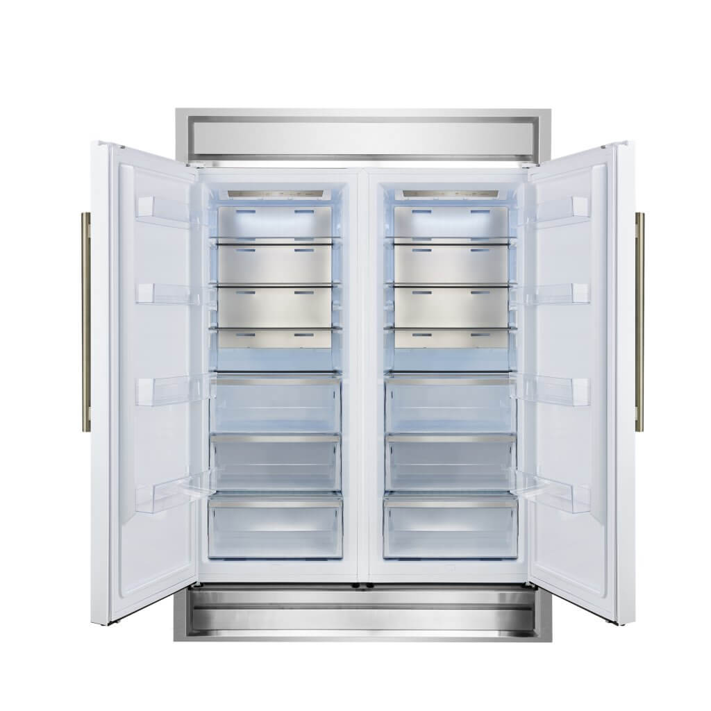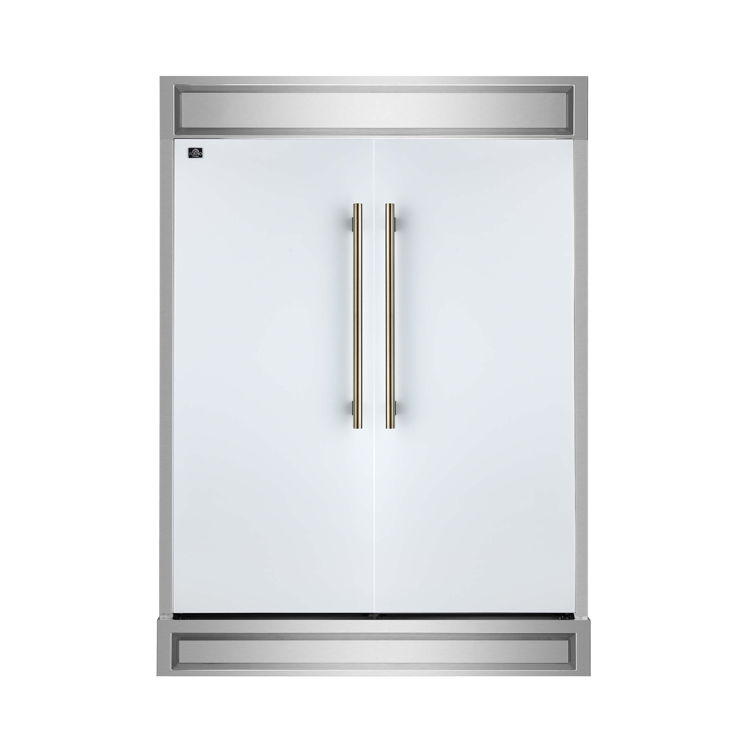The Forno Maderno offers a premium 60-inch built-in refrigerator look by combining two 28-inch refrigerators with a trim kit for seamless integration. Available in white and featuring antique brass handles, it’s part of our elegant Espresso line. With 27.2 cu.ft. of total capacity, it delivers generous storage and features Convertible Cooling Zones, Total No-Frost Technology, and a refined control panel. Six glass shelves with silver trims, 6 drawers, and LED lighting enhance both organization and visibility. The VCM doors and metal back panel ensure long-lasting durability, while the Energy Star Certification guarantees sustainability.