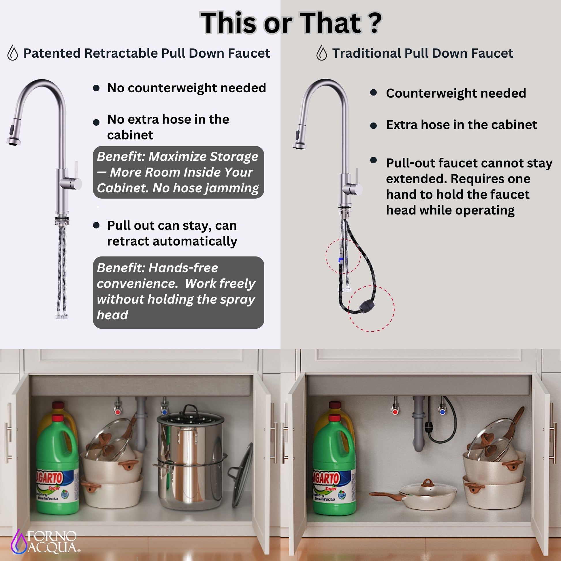 * Patented Retractable Faucet Design Eliminates Extra Hose & Weight, Giving More Room Inside Cabinet