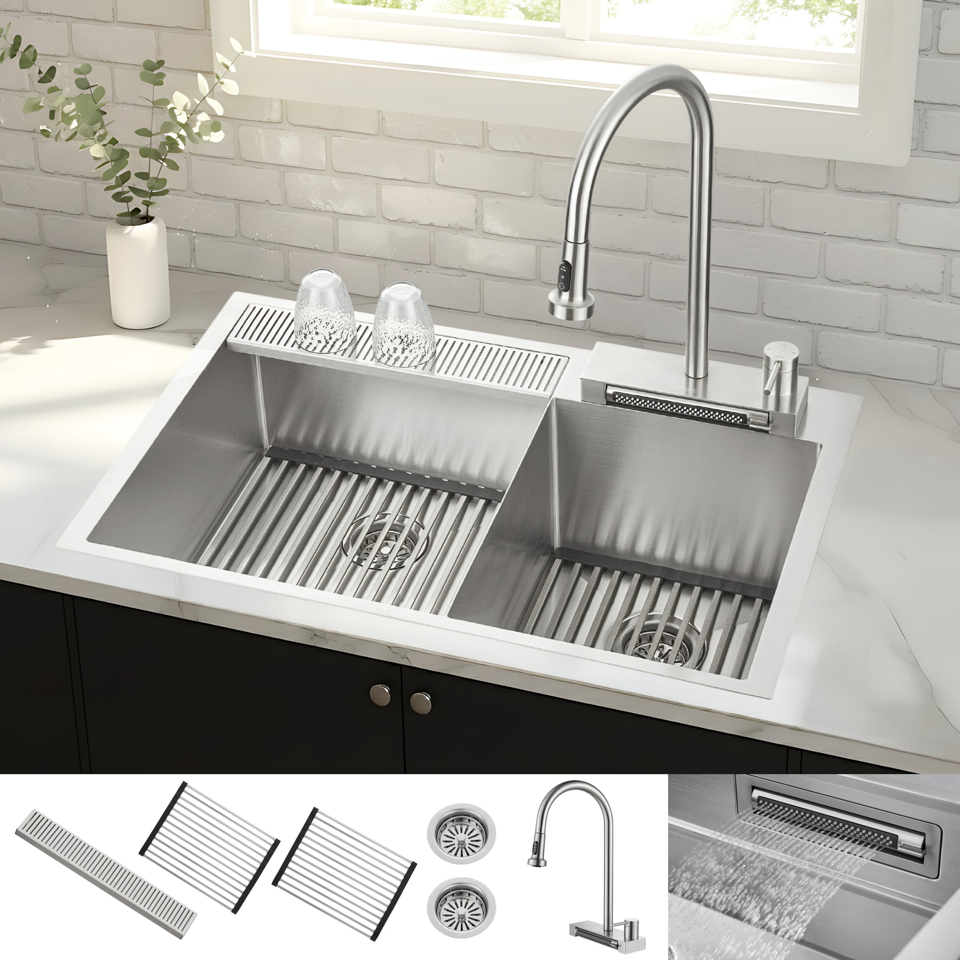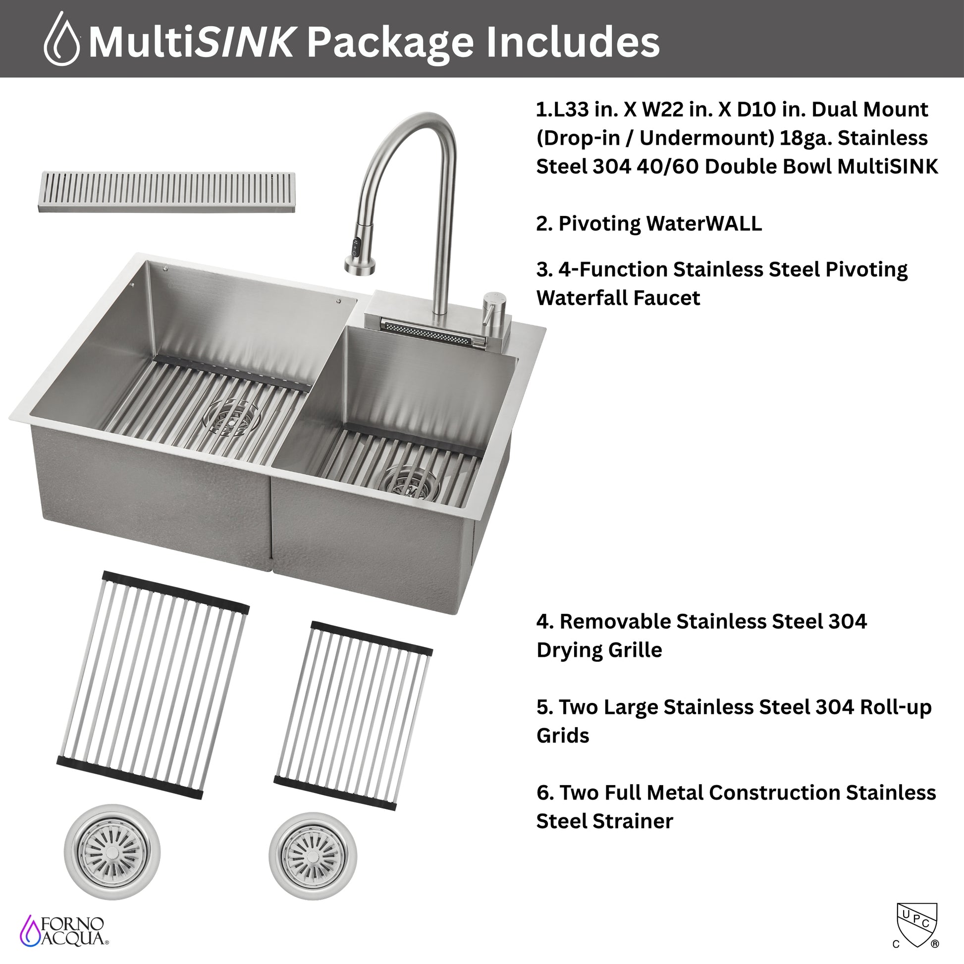 FORNO ACQUA 33 in. Drop-In/Undermount 40/60 Double Bowl Stainless Steel Sink with Waterfall Faucet
