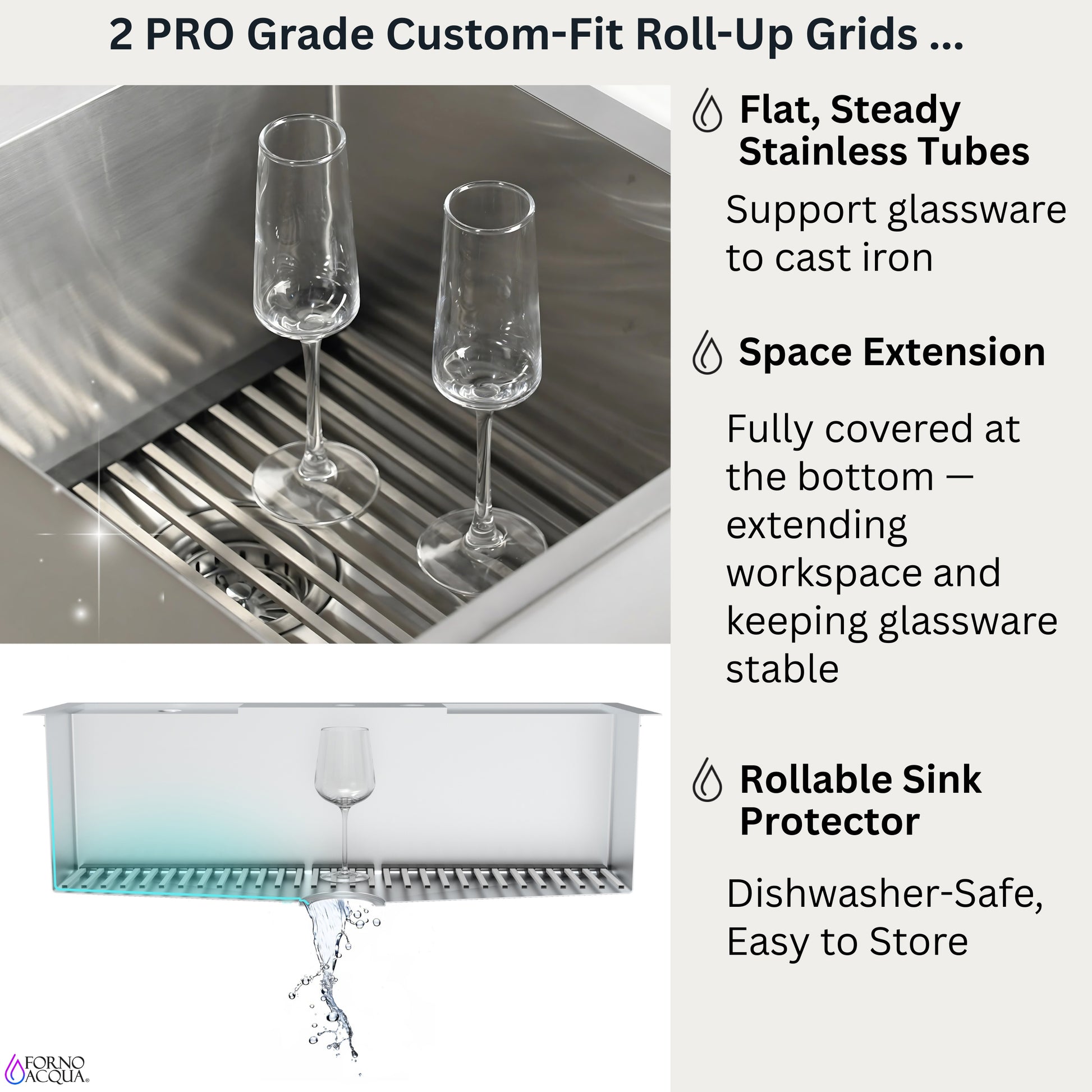 * 2 Flat Stainless Steel Roll-Up Grids Protect Sink Bottom, Extend Workspace & Keep Glassware Stable — Dishwasher-Safe